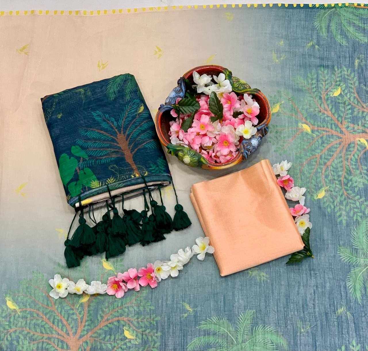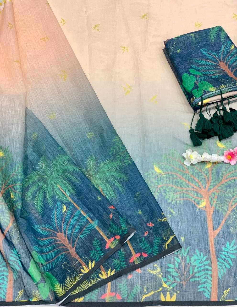 Saree Fabric: Soft Linen Cotton with beautiful digital print and elegant handmade cotton tassels