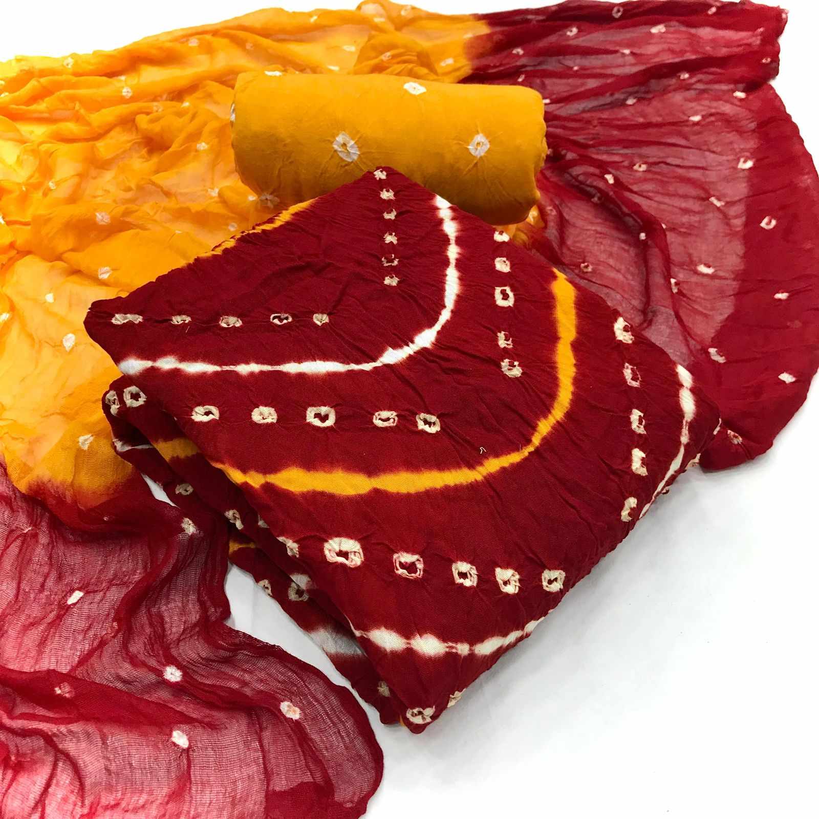 KT GULZAR Red Pure Rayon Leriya Petern Bandhni Dress Materail has been successfully added to your cart .